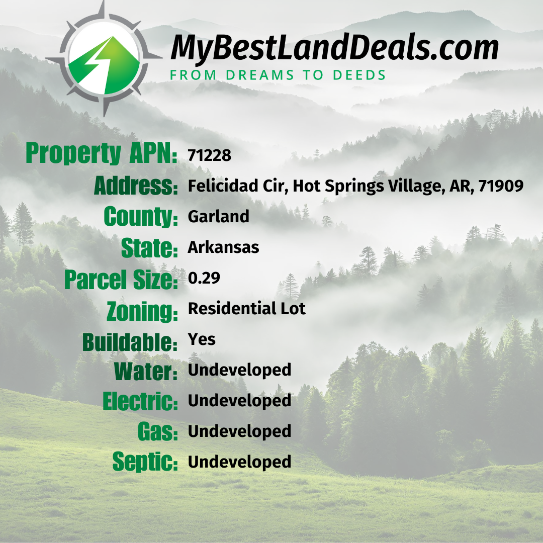Welcome to the heart of Garland County, where a .29-acre canvas in Hot Springs Village awaits your dream home. Offered exclusively by MyBestLandDeals.com, this prized parcel of Arkansas offers endless possibilities for future homeowners. It’s an affordable entry into a community where opportunity and natural beauty meet, all within reach of Little Rock’s vibrant cityscape. Embrace the chance to craft your own retreat in a place where the cost of living is as inviting as the landscape.