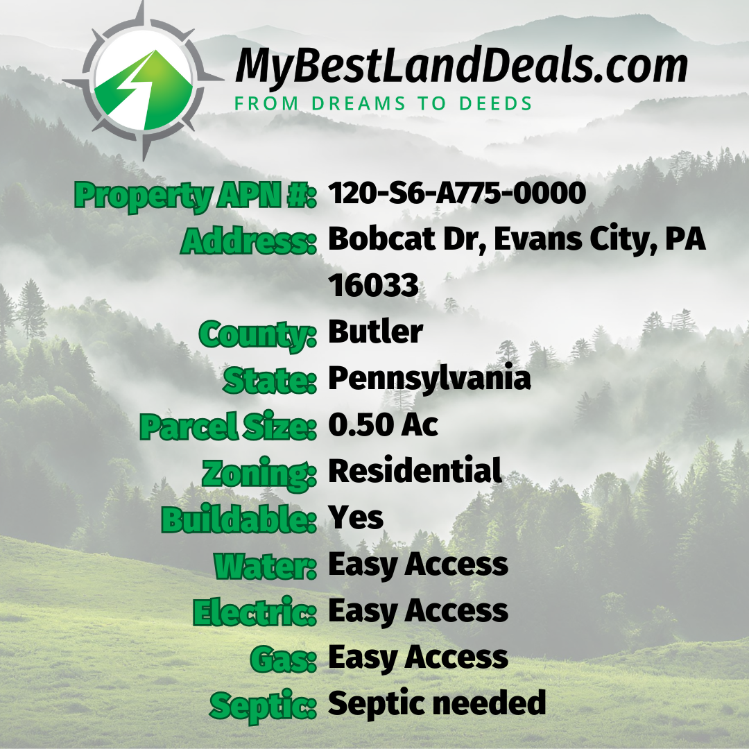Welcome to an exclusive opportunity to own a piece of natural beauty in the serene landscapes of Evans City, PA. This 0.5-acre parcel, originally valued at $20,000, is now being offered at a remarkable discounted rate of $15,000, presenting a rare chance to secure your dream property at nearly 25% off the market value.