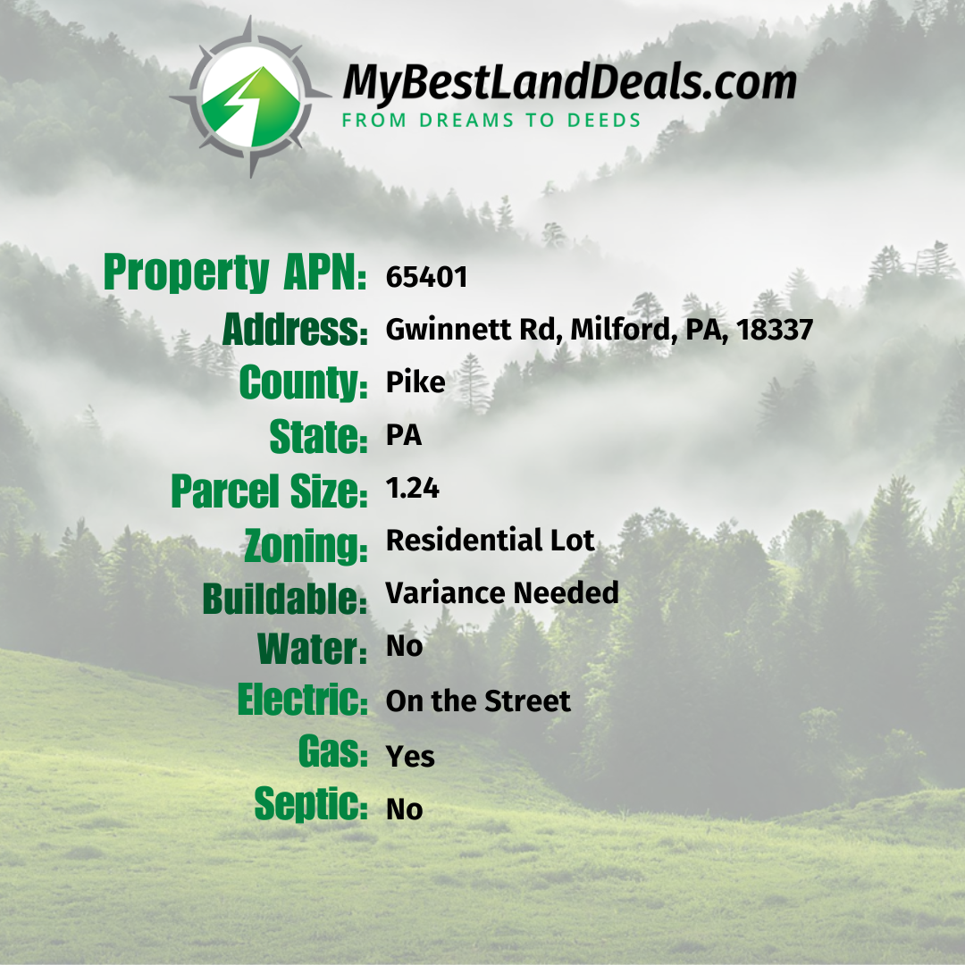 Imagine a life where you can breathe fresh mountain air every day, located on Gwinnett Rd, in the heart of Milford, PA. This property is not just a piece of land; it's a gateway to a life amongst the Poconos' enchanting forests and state parks, such as the nearby Delaware Water Gap. With easy access to main roads and essential services, including the Milford Police Department and Goshen Medical Associates, convenience is at your doorstep. For the commuter or weekend explorer, proximity to major urban centers is unmatched, with effortless commutes to the NY and NJ areas.