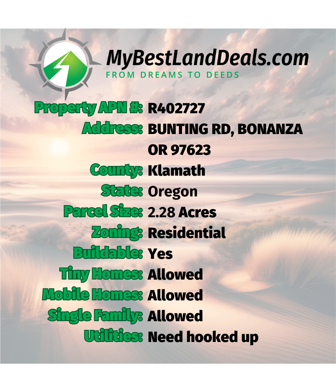 Discover the epitome of tranquility with this pristine 2.28-acre property, nestled off Bunting Road in the heart of Bonanza, Oregon. Offered by MyBestLandDeals, this vacant land presents a unique opportunity to craft your personal sanctuary amid the scenic wilderness of Oregon. Escape the bustle of city life and immerse yourself in a world where nature’s beauty is your closest neighbor.