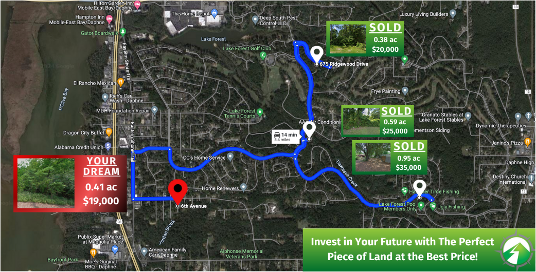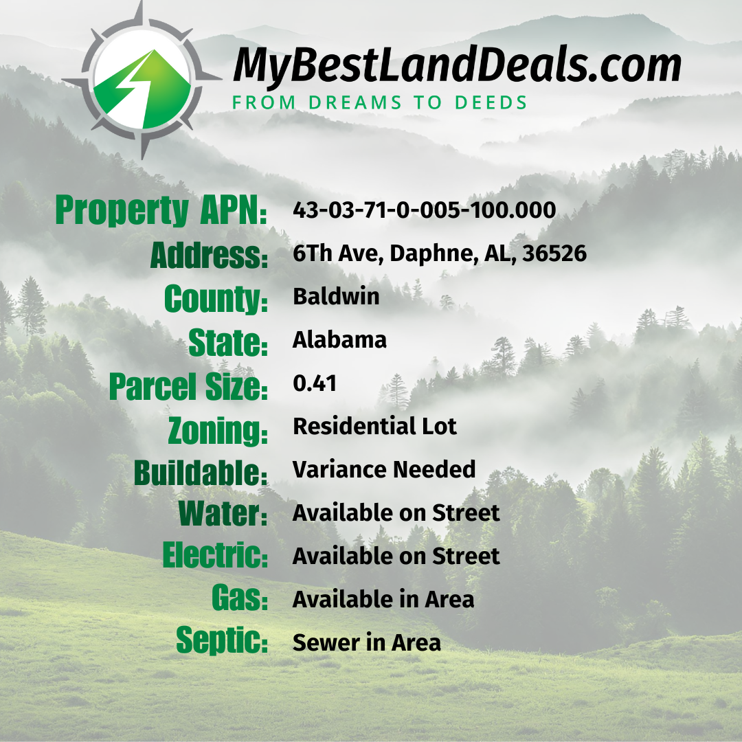 Step into the opportunity of a lifetime with this expansive .41-acre plot in the heart of Daphne, AL, proudly offered by MyBestLandDeals. Located in a serene enclave off 6th Avenue, this property is a beacon for those seeking exceptional value in a rapidly growing real estate market. Whether you’re drawn to the minimalist allure of tiny home living or envision building a traditional family home, this parcel provides the perfect backdrop. Daphne, known for its exceptional quality of life, strong community spirit, and promising investment prospects, offers a vibrant setting for your dream project. With its proximity to Mobile, Spanish Fort, and natural wonders like Bayfront Park, this land promises a balanced lifestyle of peace and convenience. Embrace the chance to create a home that reflects your values in a community that supports vibrant living.